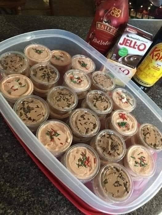 Spoon or pipe the mixture into small plastic shot cups (2 oz size works best). Top each one with festive Christmas sprinkles or a dash of chocolate shavings for that professional holiday look.