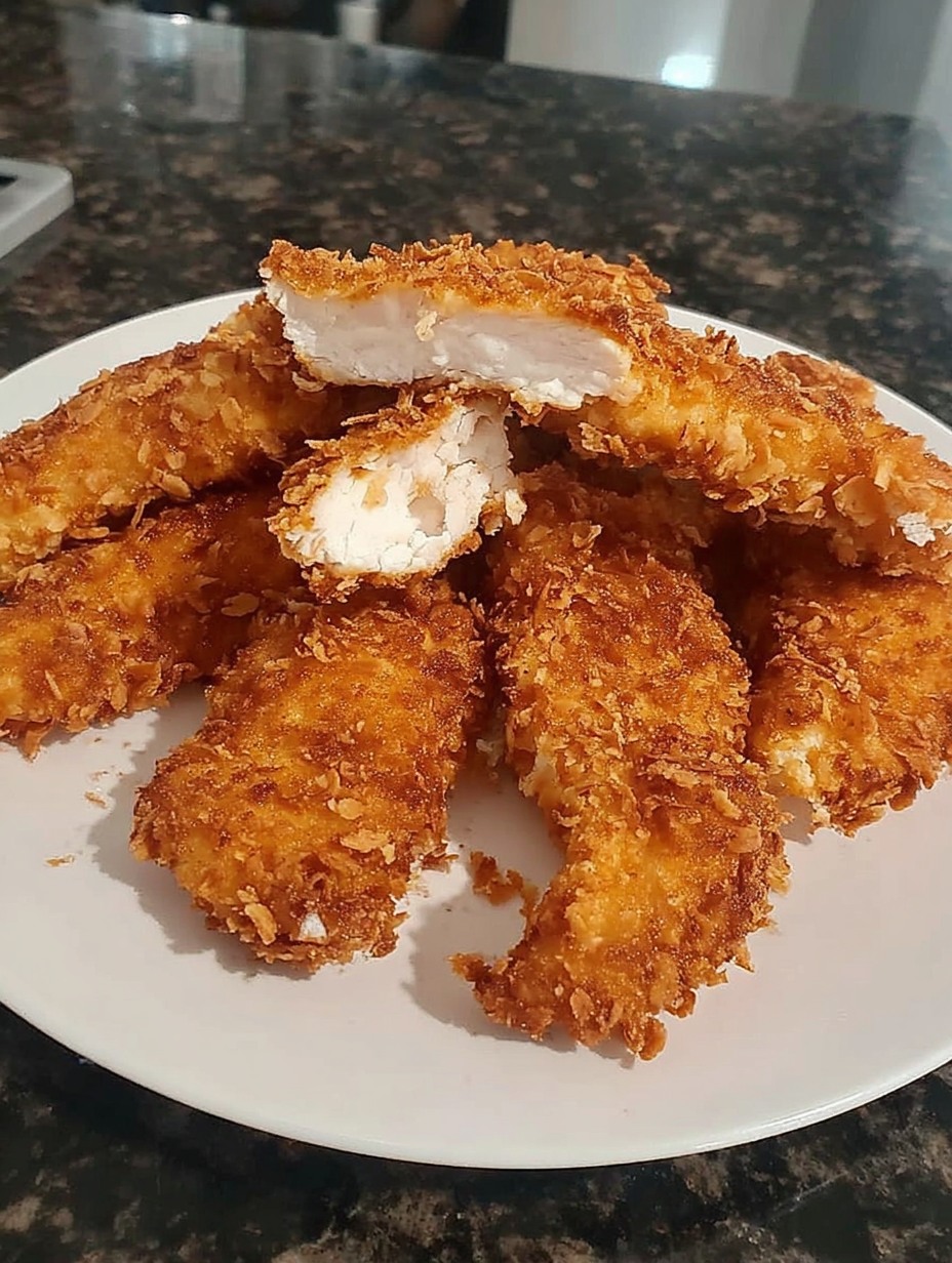 - Dredge & Dip: Coat each chicken strip in flour, dip into the egg wash, and finally press firmly into the crispy coating until fully covered. 🍗🤝✨