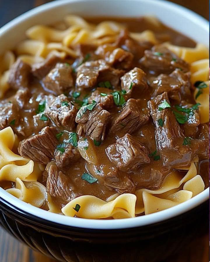 - Combine & Serve: You can either stir the noodles directly into the crockpot or spoon a generous portion of the beef and gravy right over a mountain of noodles as seen in the photo! 🥄🌊👑