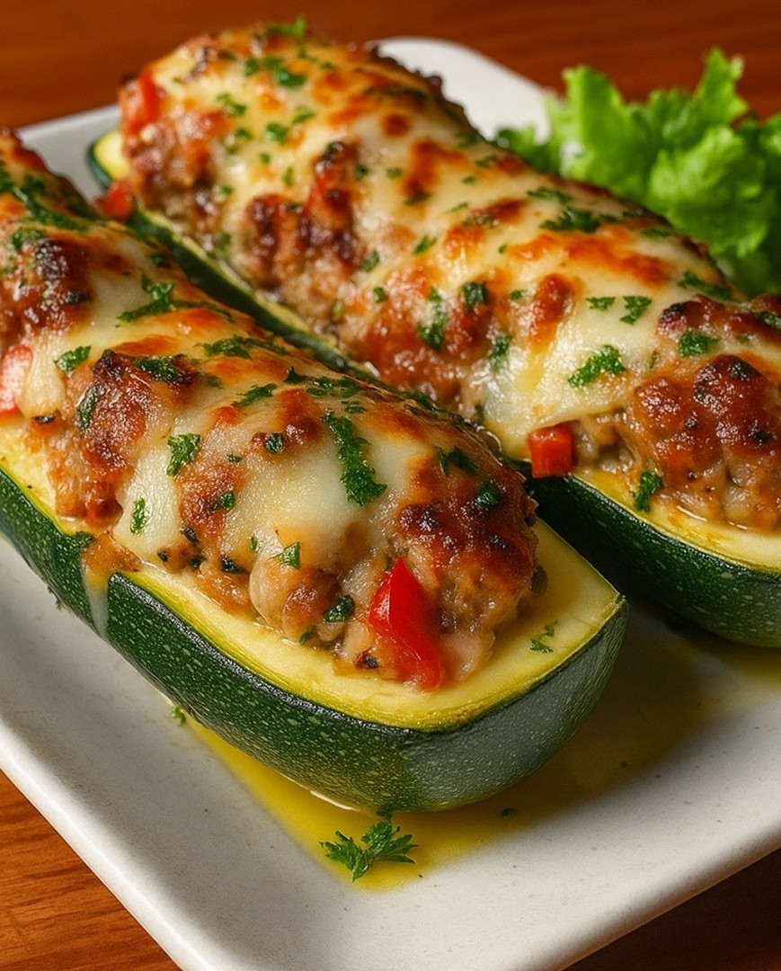 Faszerowane cukinie:Składniki:4 średnie cukinie1 szklanka ugotowanego ryżu1/2 szklanki drobno posiekanej cebuli…….