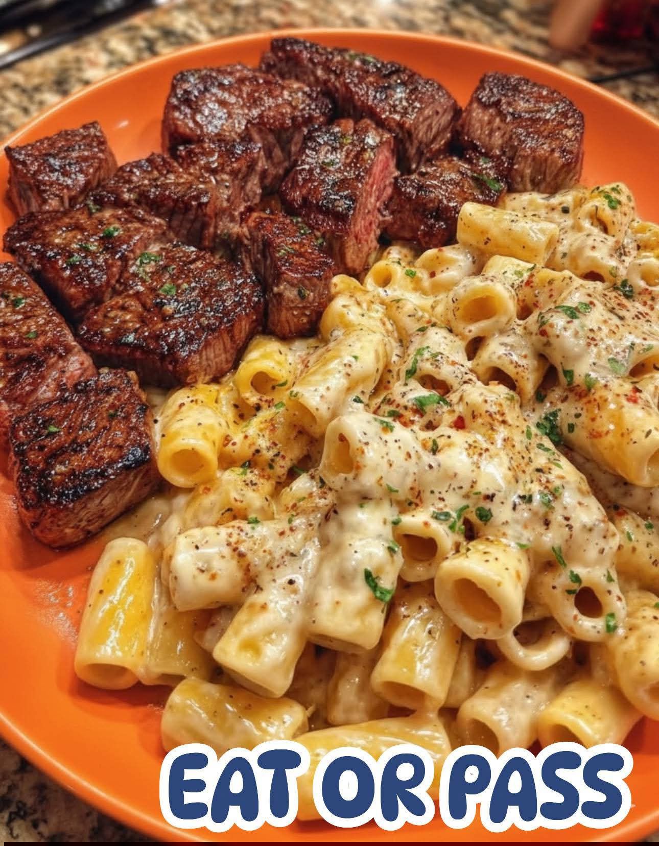 - The Big Toss: Add the cooked penne and steak bites back into the skillet. Toss everything together until every noodle is hugged by that garlic butter sauce. (Add a splash of pasta water if you want it even creamier!) 🍝🥩🌪️