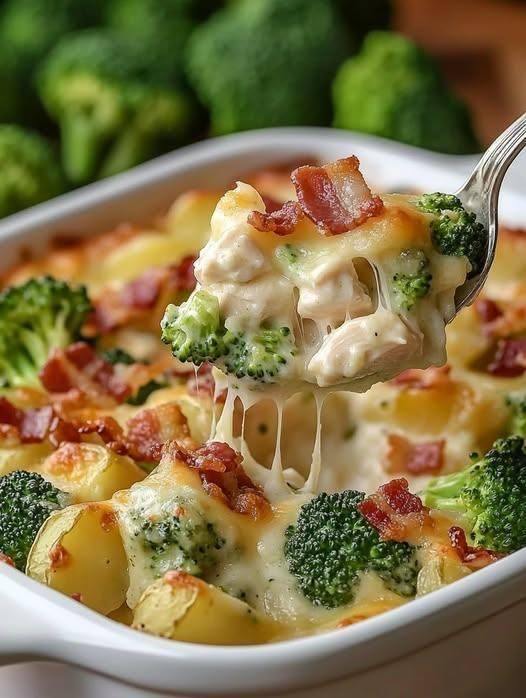 3. The Big Mix: In a large baking dish, toss together your cooked chicken, steamed broccoli, and half of the crispy bacon bits. 🍗🥦🤝