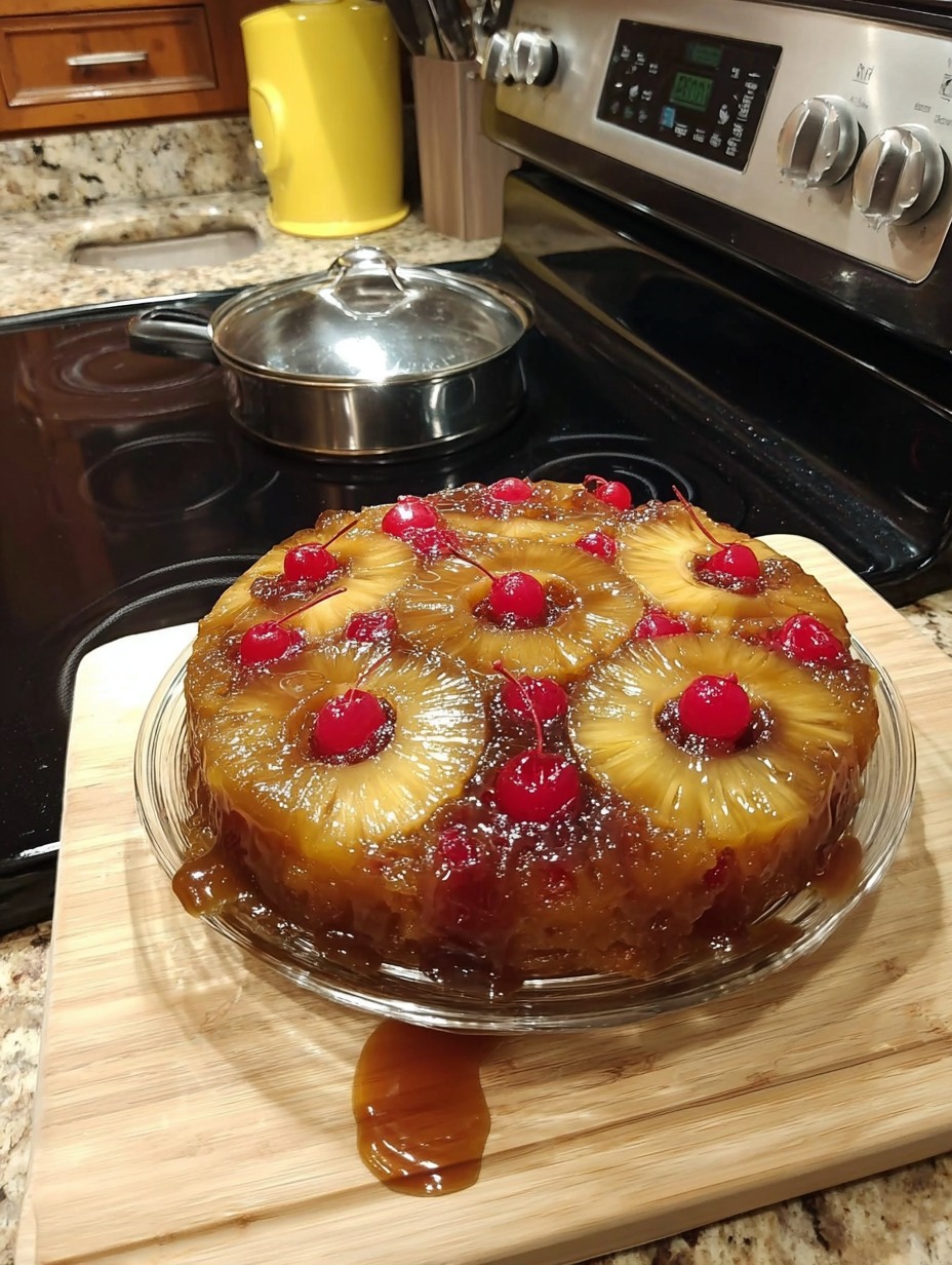 - Arrange the Fruit: Lay your pineapple rings in a beautiful circular pattern over the caramel, then place a cherry in the center of each ring as seen in the photo. 🍍🍒🎨