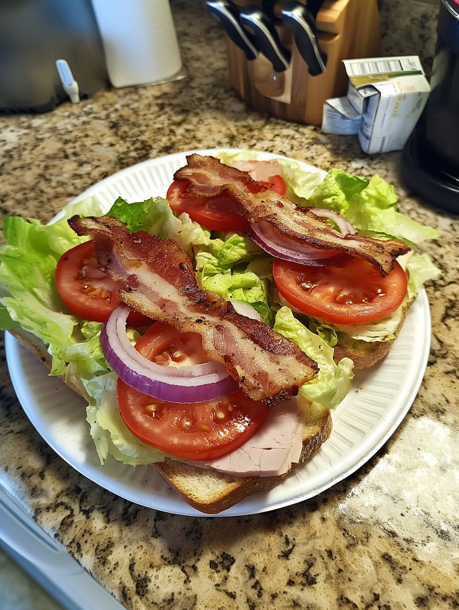 - Layer the Protein: Start by placing a generous portion of sliced turkey directly onto the bread, followed by your two strips of crispy bacon. 🦃🥓🤝