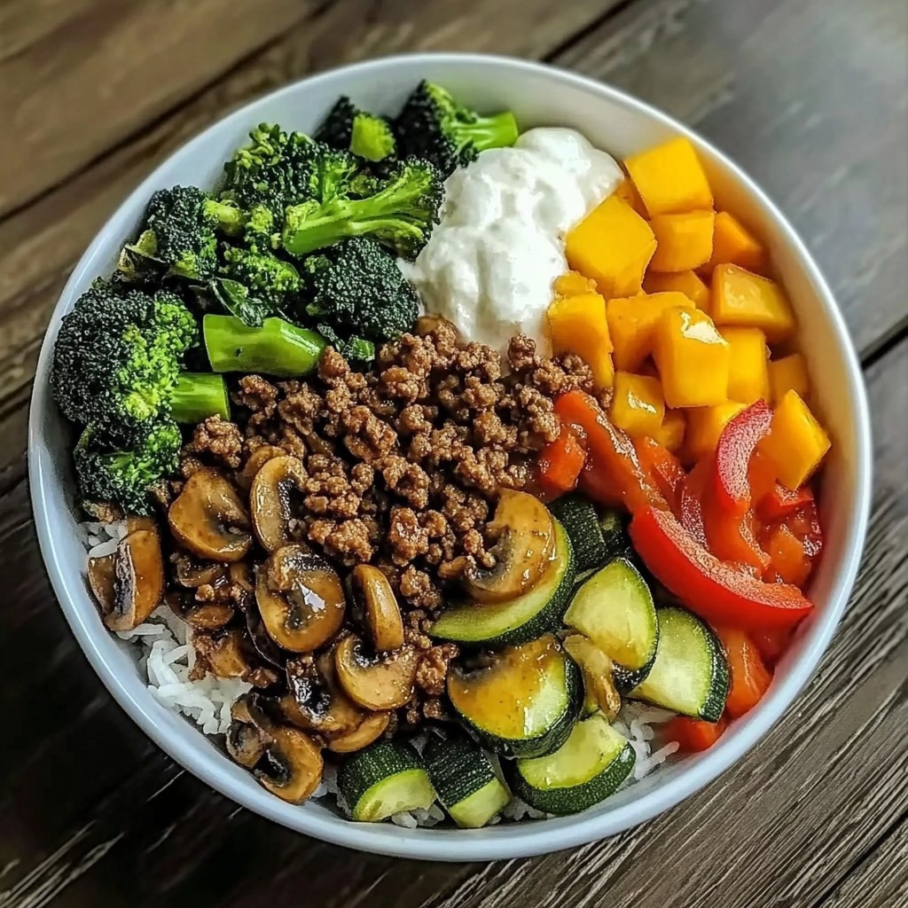 Miska ryżu z mielonym mięsem i smażonymi warzywami