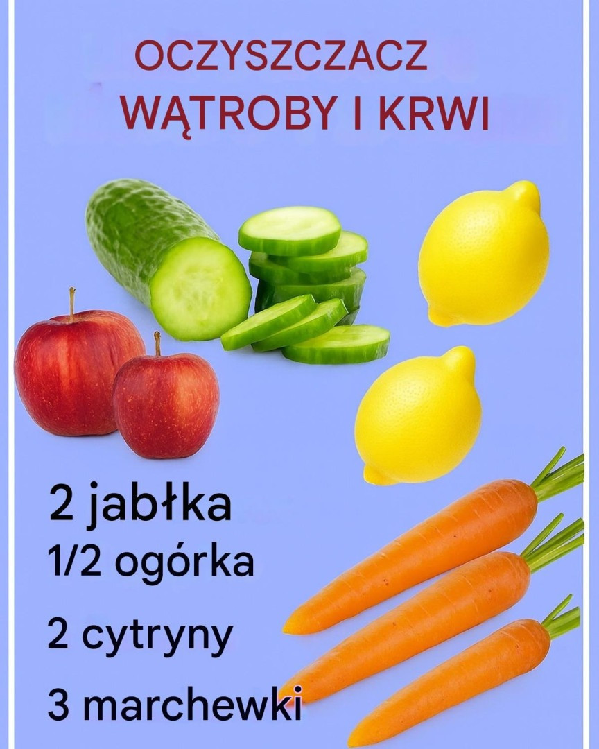 Oczyszczacz wątroby i krwi – łatwy w mieszaniu 2 jabłka – zawierają przeciwutleniacze, które wspomagają prawidłową pracę wątroby ½ ogórka – nawadnia i pomaga organizmowi wydalać odpady 2 cytryny – naturalne źródło witaminy C, która wspomaga detoksykację 3 marchewki – Dostarczają beta-karotenu, który wspomaga zdrowie krwi. Umyj, posiekaj i zmiksuj wszystko na gładką masę. Pij świeże, aby uzyskać delikatny i odżywczy zastrzyk energii. Link znajdziesz w komentarzu