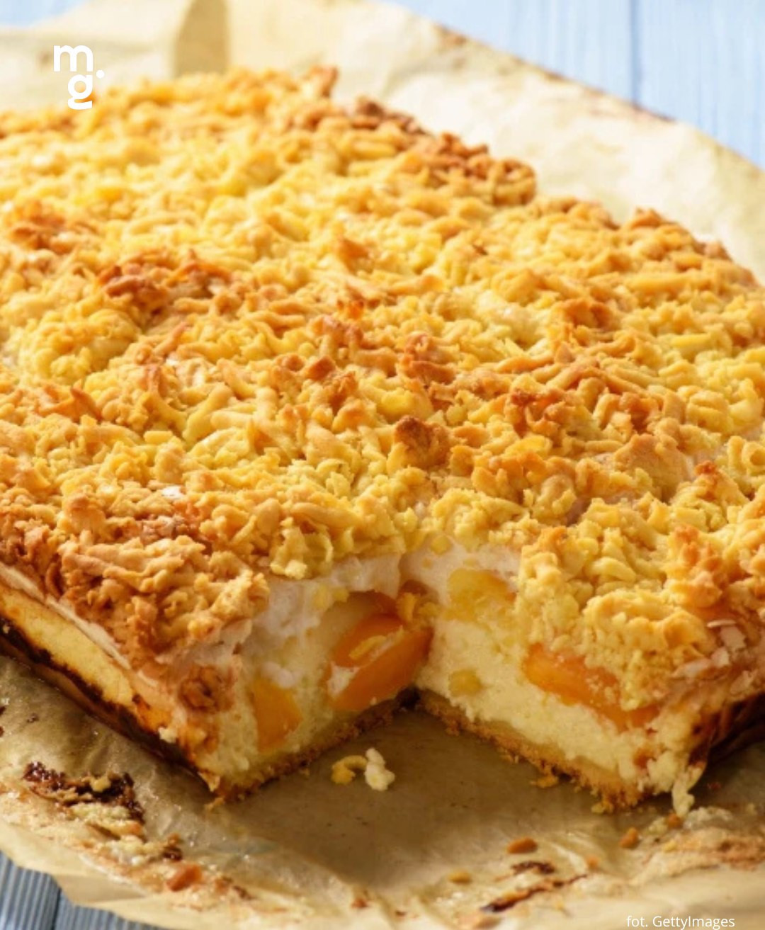 Ten kultowy sernik zachwyca na każdym rodzinnym spotkaniu. To jeden z tych domowych wypieków, które przechodzą z pokolenia na pokolenie – prosty, pewny i zawsze udany. Sernik z brzoskwiniami, delikatną bezą i chrupiącą kruszonką znika ze stołu w mgnieniu oka, dlatego najlepiej od razu przygotować dużą blachę. To prawdziwy król domowych ciast: wilgotny, aromatyczny i pięknie się prezentuje.