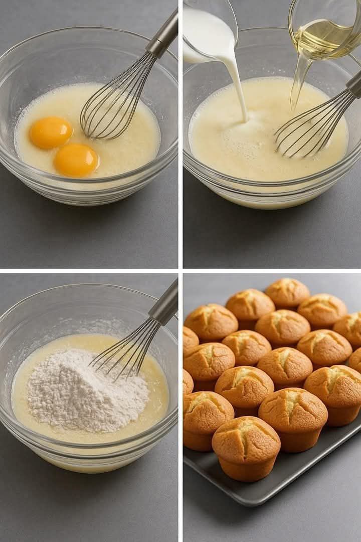 - Mix Dry & Wet: In a large bowl, whisk together the flour, sugar, baking powder, and salt. Make a well in the center and add the eggs, milk, oil, and vanilla. 🌾🥚🥛🌪️